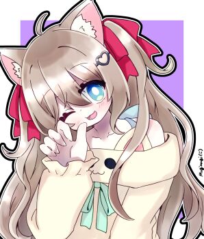 1girl :3 :d alternate_costume animal_ear_fluff animal_ears animal_print artist_name blue_eyes border brown_hair casual cat_ears cat_print claw_pose collarbone frilled_sleeves frills green_ribbon hair_between_eyes hair_ornament hair_ribbon halterneck hand_up...