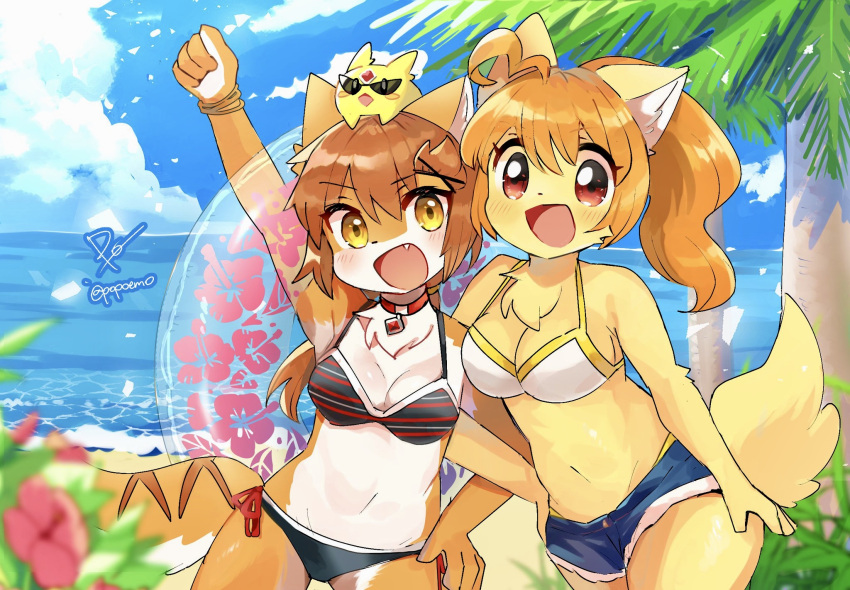 ambiguous_gender anthro beach bikini biped blush bottomwear brown_hair canid canine clothing collar cute_fangs cutoffs denim denim_clothing eyebrow_through_hair eyebrows eyewear female feral flower fur grass group hair hand_on_hip hi_res...
