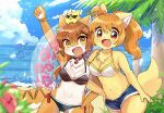ambiguous_gender anthro beach bikini biped blush bottomwear breasts brown_hair canid canine clothing collar cute_fangs cutoffs denim denim_bottomwear denim_clothing eyebrow_through_hair eyebrows eyewear female feral flower fur grass group hair...