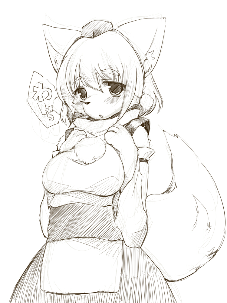 animal_ears detached_sleeves furry hat inubashiri_momiji monochrome shinobe solo tail tokin_hat touhou wolf_ears wolf_tail