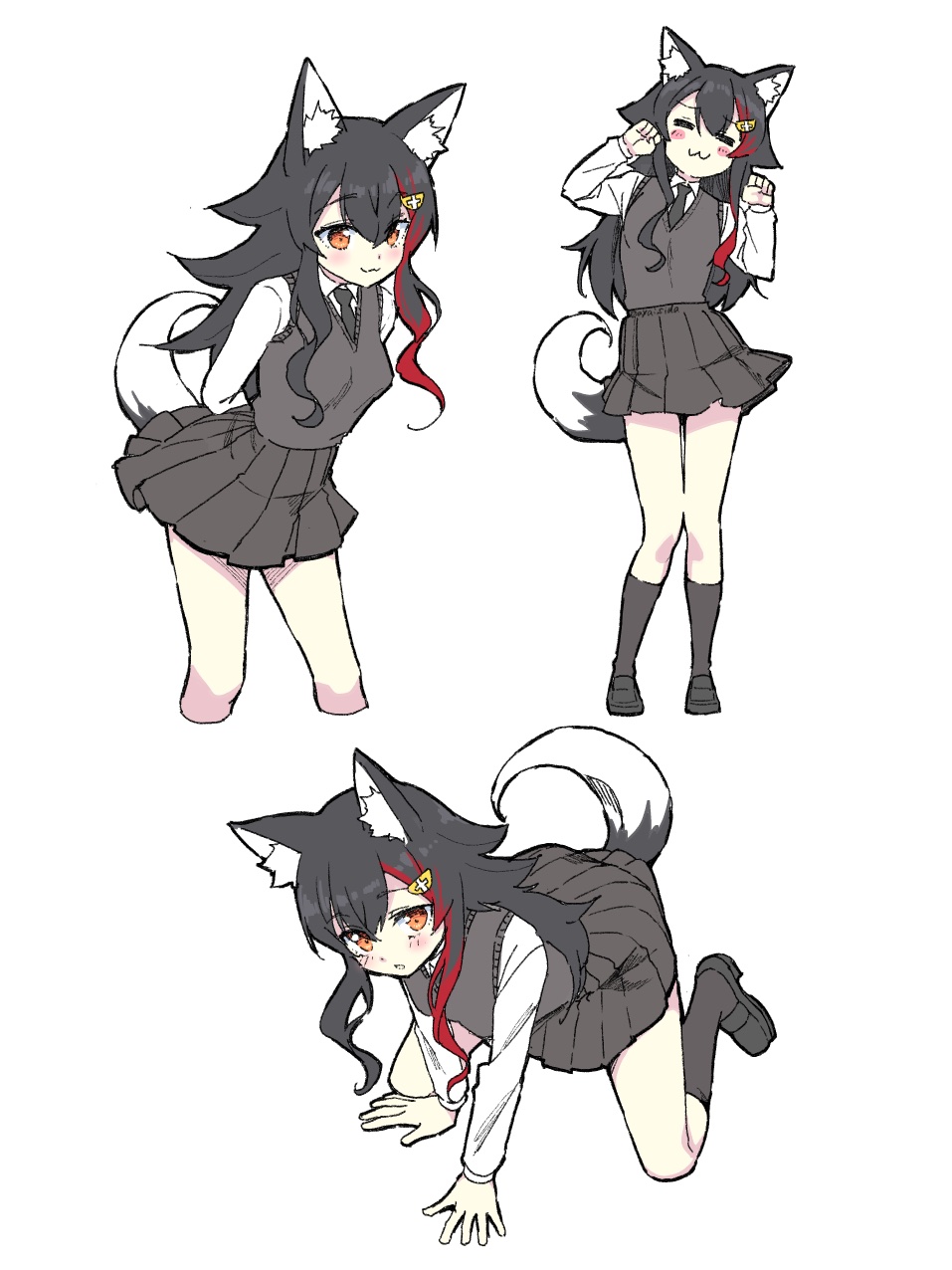 1girl :3 == all_fours alternate_costume animal_ear_fluff animal_ears arms_behind_back black_footwear black_hair black_necktie black_skirt black_socks blush brown_eyes commentary_request cropped_legs full_body grey_sweater_vest hair_ornament highres hololive ishida_aya loafers...