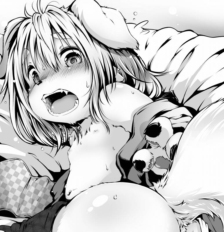 anthro black_and_white blush butt canid canine canis claws clothed clothing domestic_dog fangs female flat_chested hair kemono koishi_chikasa mammal monochrome nipples open_mouth partially_clothed pawpads short_hair solo teeth tongue young...
