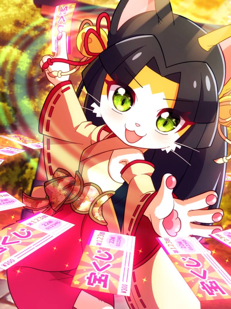 an anime character with black hair and yellow eyes holding a red object in her hand