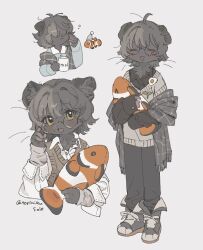 donmai.moe1girl == ahoge animal_ears black_fur black_hair black_pants blush body_fur brown_sweater_vest cat_ears closed_eyes cropped_torso cup facing_viewer full_body furry furry_female glasses gomafuto grey_background holding holding_cup holding_stuffed_toy looking_at_viewer... post #8272788.
