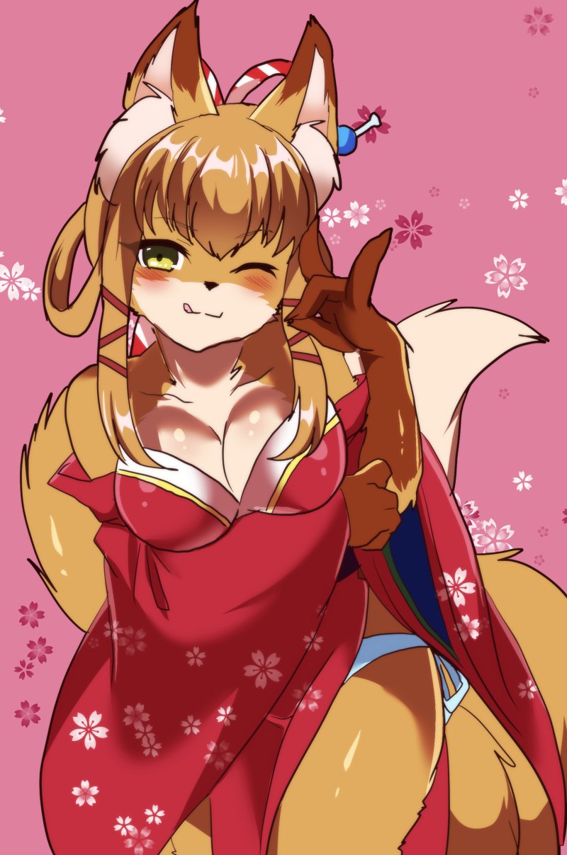 artist_request brown_hair character_request chinese_clothes copyright_request fox furry long_hair one_eye_closed tongue
