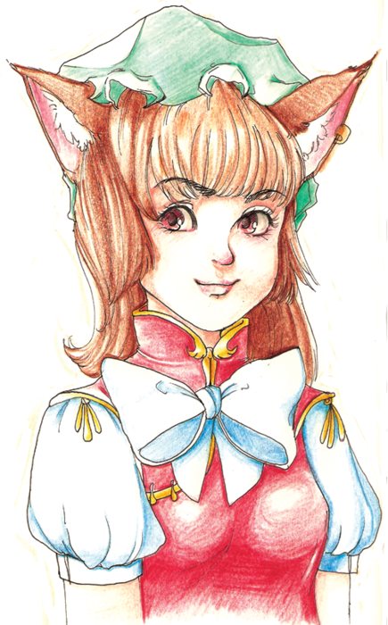 animal_ears bow bust cat_ears chen colored_pencil earrings hat jewelry lips pencil short_hair smile solo touhou traditional_media twinkle-journey
