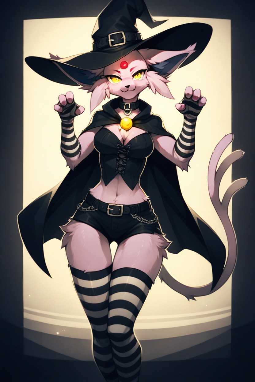 createporn.com20+, Худое, Большая задница, Мини-юбка, Ведьма, Неон, yellow eyes, espeon, paws, fluffy, looking at viewer, black and white striped stockings, striped gloves black and white, black collar, colorful picture, cat pose | NSFW с искусственным интеллектом.