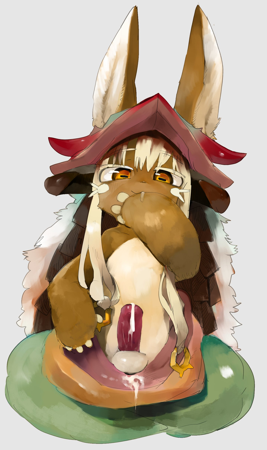 absurd_res after_orgasm anthro balls bodily_fluids bottomwear bottomwear_down clothed clothing cum cum_in_clothing cum_on_penis erection femboy genital_fluids genitals hi_res lagomorph leporid liteu looking_at_viewer made_in_abyss male mammal nanachi narehate naughty_face pants...