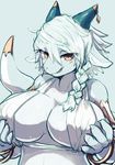 tbib.organthro big_breasts blue_body blush braided_hair breasts cleavage clothed clothing dragon female grey_background grey_hair hair hanadaiteol holding_breast horn huge_breasts kemono long_hair mythological_creature mythological_scalie mythology naughty_face nere non-mammal_breasts...