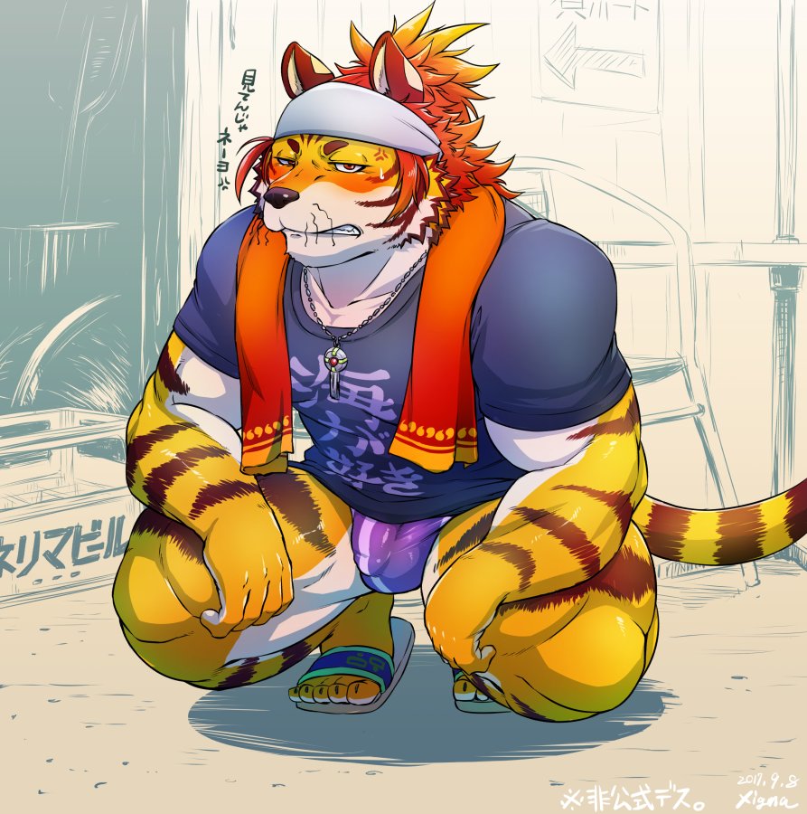 tbib.organthro bulge clothing feline flip_flops fur hair headband headgear japanese_text looking_at_viewer male mammal muscular muscular_male penis_outline shiny slav_squat speedo swimsuit text xigmamgix score: rating:questionable. anthro bulge clothing feline flip_flops fur hair headband headgear japanese_text looking_at_viewer male mammal muscular muscular_male penis_outline shiny slav_squat speedo swimsuit text xigmamgix.