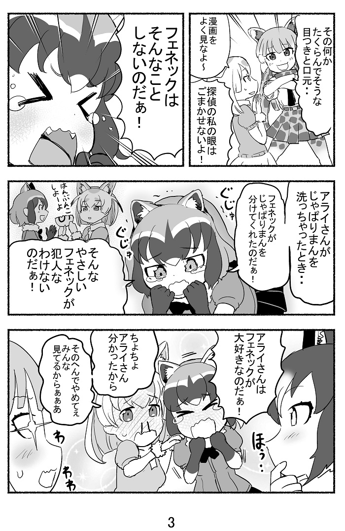 4girls comic common_raccoon(kemono_friends) fennec(kemono_friends) food grey_wolf(kemono_friends) japari_bun japari_symbol kemono_friends monochrome multiple_girls nattou_mazeo number page_number reticulated_giraffe(kemono_friends) text translation_request