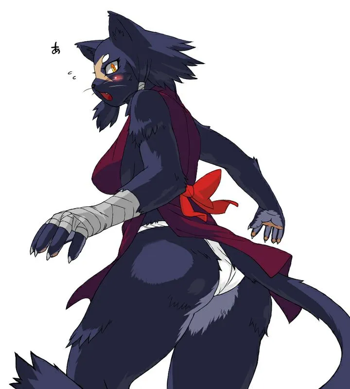 2007 anthro asian_clothing bandage blush bottomwear breasts butt claws clothed clothing domestic_cat east_asian_clothing felid feline felis female fundoshi japanese_clothing japanese_text kemono kemonon mammal ninja ribbons scar skirt solo...