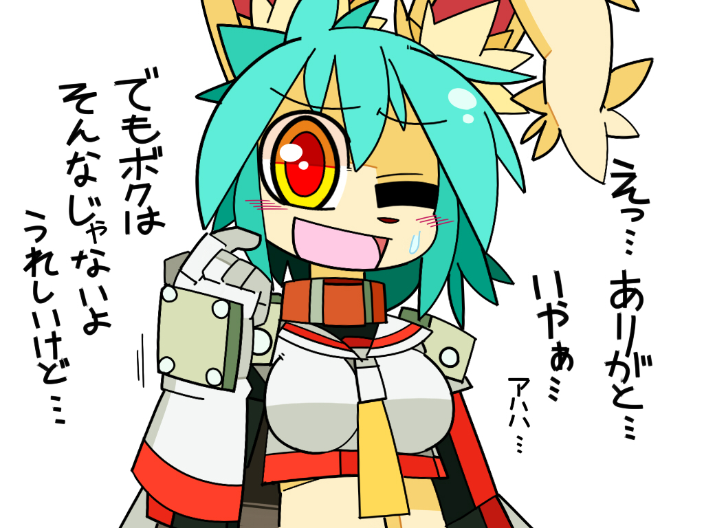 1girl aqua_hair breasts female furry glasses imouchi_sutan japanese one_eye_closed open_mouth rabbit red_eyes simple_background solo translation_request upper_body white_background