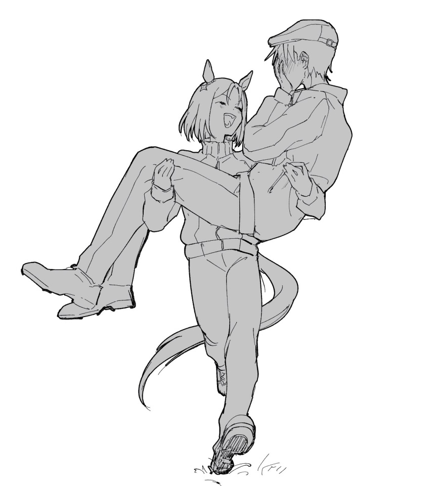 kagamihara.donmai.us1boy 1girl animal_ears carrying ear_covers ear_ornament highres horse_ears horse_girl horse_tail horseshoe_ornament narita_top_road(umamusume) okita_trainer open_mouth princess_carry short_hair single_ear_cover smile sonabaija tail tracen_training_uniform umamusume umamusume... post #8114849.