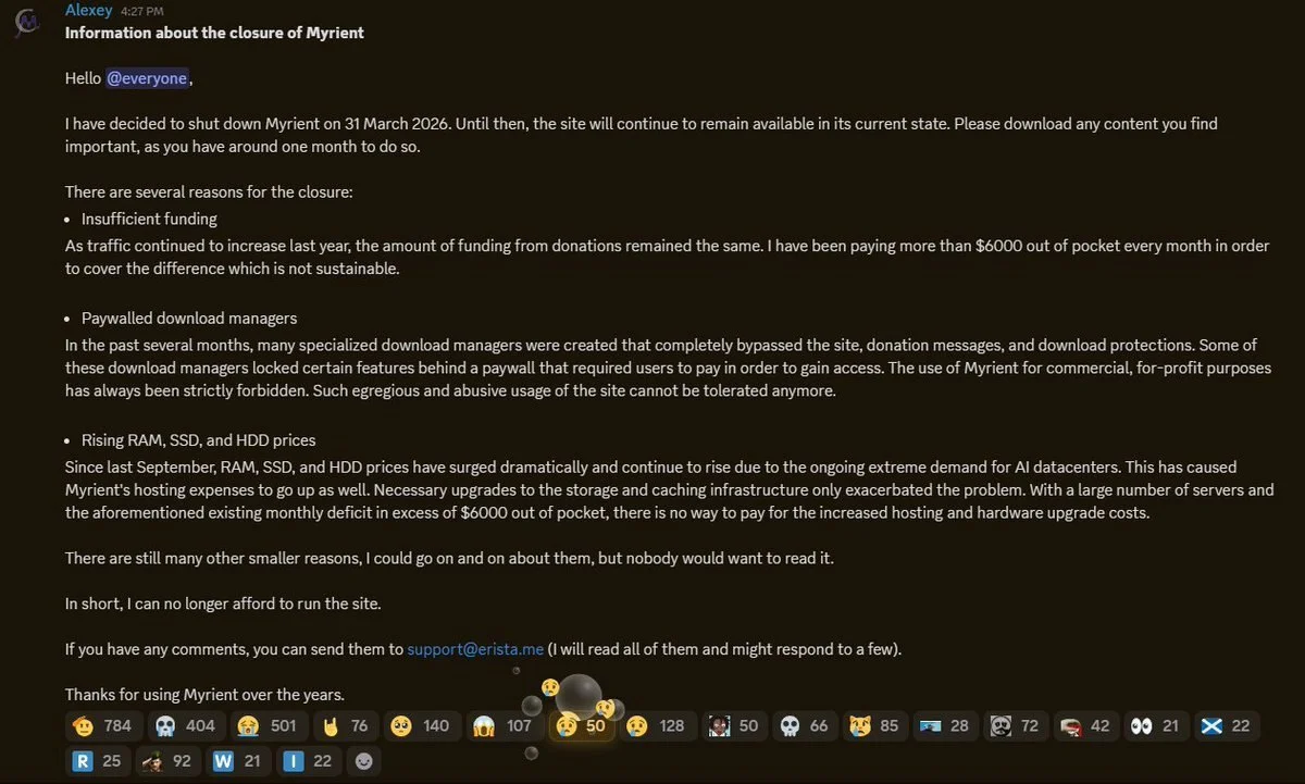 Myrient, a major video game preservation archive hosting over 390 terabytes of organized ROMs, ISOs, and collections, is shutting down on March 31, 2026.They...