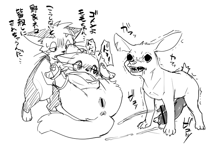 manmosu marimo, 2018, censored, japanese text, simple background, text, translation request, white background, anus, blush, canid, canine, canis, domestic cat, domestic dog, erection, felid, feline, felis, female, ineffective...