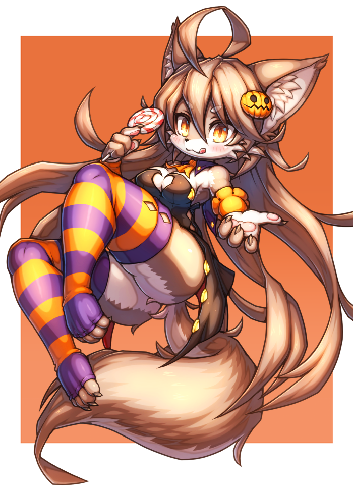 :3 ahoge animal_ears breasts brown_hair candy commentary_request food full_body furry halloween holding holding_food long_hair looking_at_viewer orange_eyes original pawpads simple_background striped striped_legwear tail thigh-highs tongue tongue_out tsuji wolf wolf_ears...