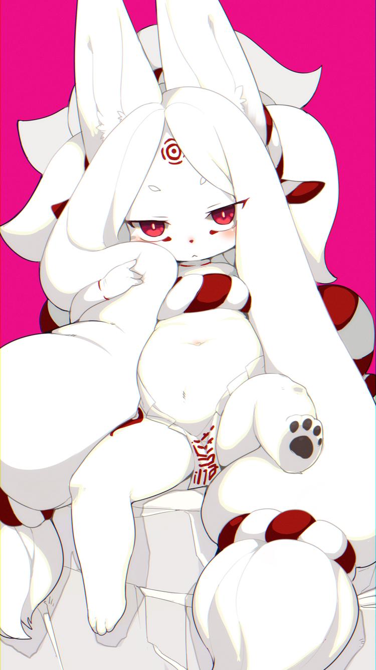 anthro belly blush canine clothing cute eyebrows feet female fox fur hair japanese kemono kishibe loli long_ears long_hair looking_at_viewer mammal navel paws red_eyes simple_background sitting slightly_chubby solo white_fur...