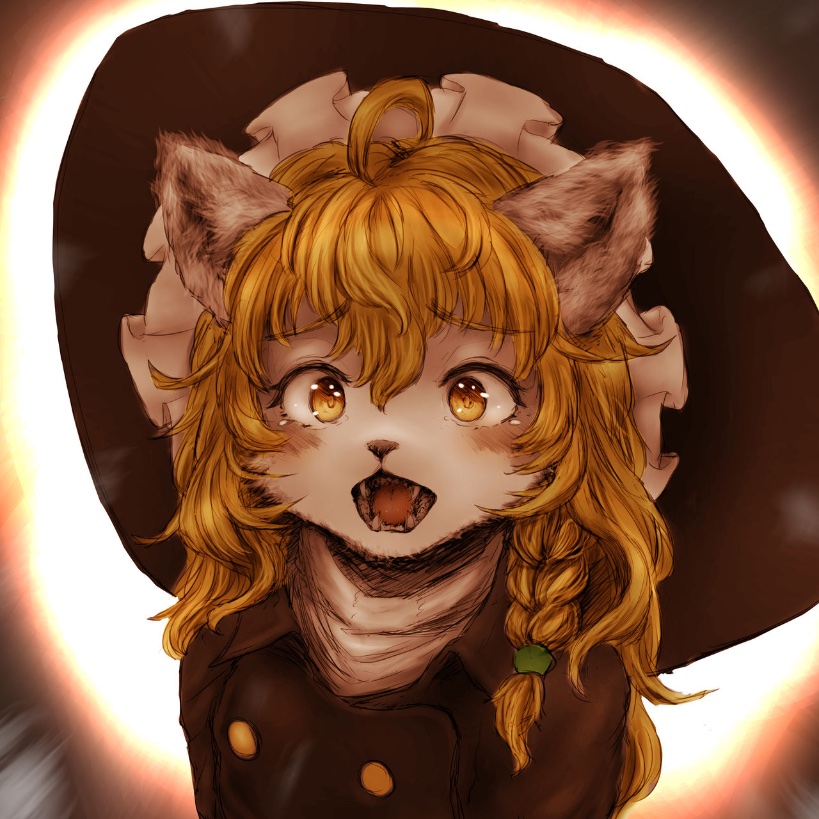 1girl ahoge animal_ears black_headwear black_shirt blonde_hair blush braid cat_ears cat_girl hat hawthorn kirisame_marisa open_mouth shiny shiny_hair shirt solo touhou upper_body witch witch_hat yellow_eyes