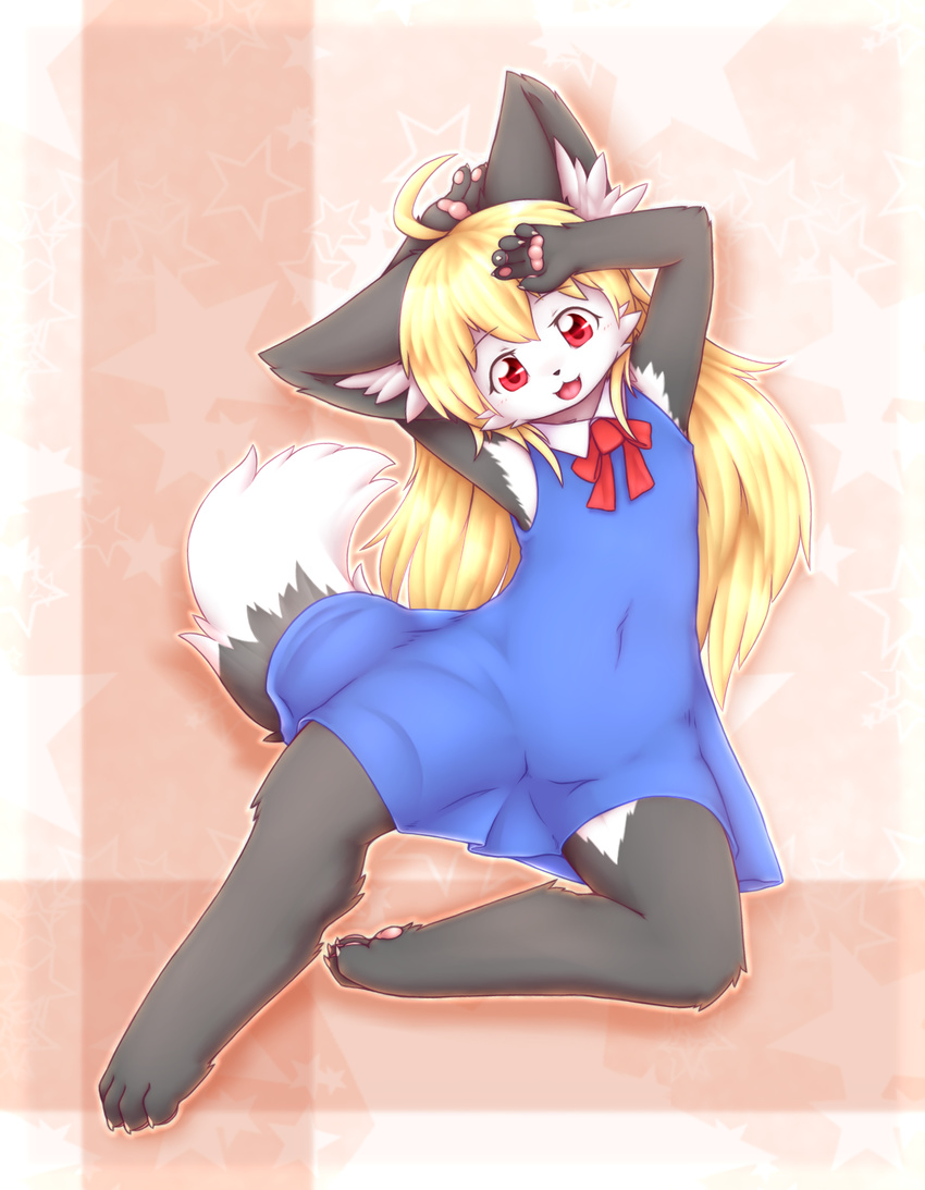 1girl akuma_gaoru blonde_hair dress female full_body furry hazuki_kai long_hair open_mouth red_eyes solo wolf score:0 rating:safe.