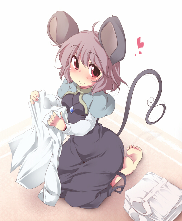 ahoge aki(akikaze_asparagus) animal_ears barefoot blush capelet dress grey_hair heart jewelry kneeling mouse_ears mouse_tail nazrin pendant red_eyes shirt simple_background smile solo tail touhou white_shirt