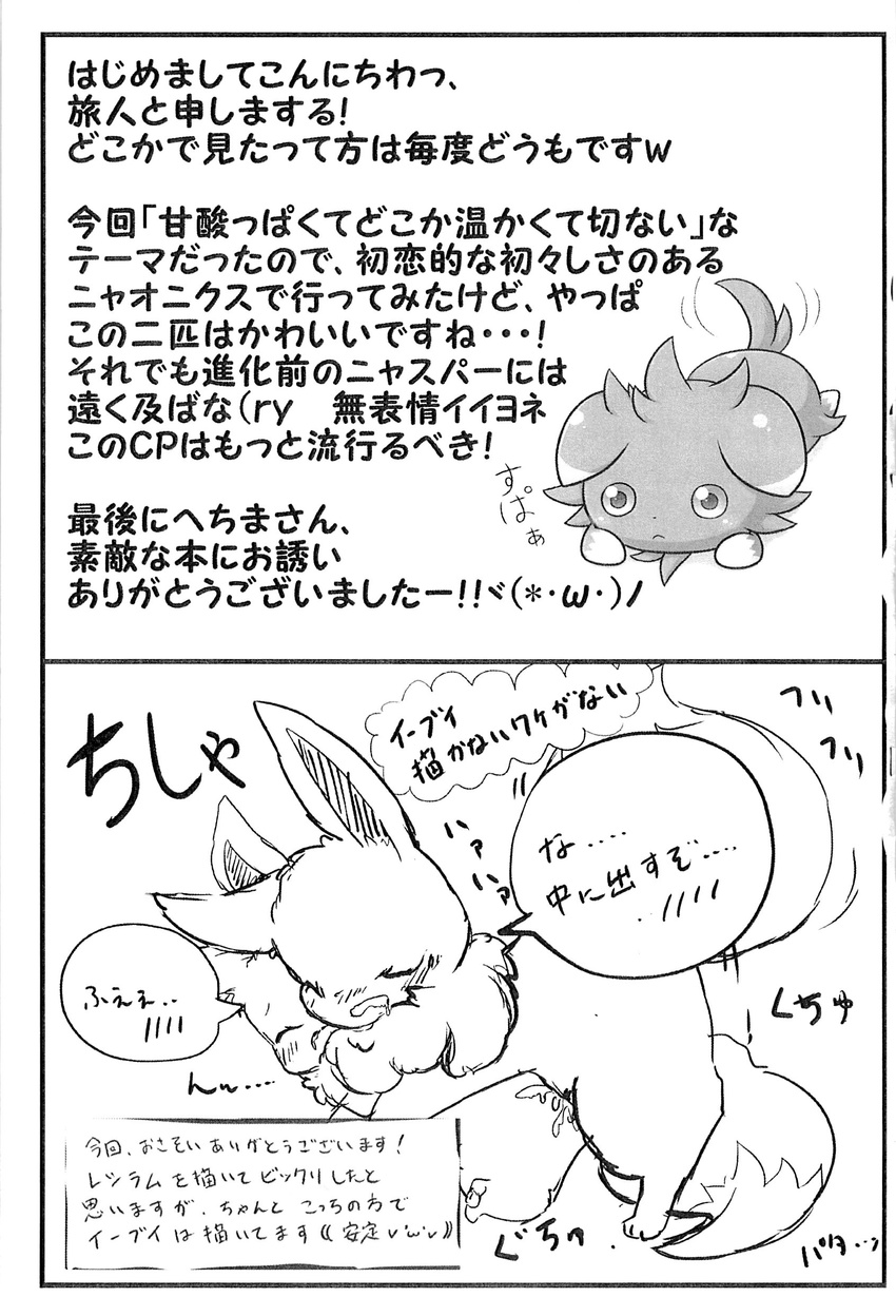 absurd_res ambiguous_gender comic duo_focus eevee espurr felid feral generation_1_pokemon generation_6_pokemon greyscale group hi_res japanese_text mammal monochrome nintendo penetration pokemon pokemon(species) solo_focus tail tail_motion tailwag text translation_request...