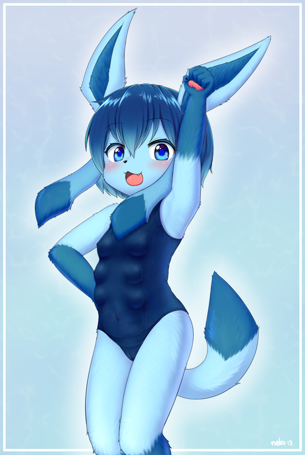 1girl animal_hands arm_up blue_eyes blue_one-piece_swimsuit blush breasts cameltoe clenched_hand covered_navel extra_breasts fang glaceon looking_at_viewer mcsadat one-piece_swimsuit open_mouth pokemon small_breasts smile solo swimsuit tail
