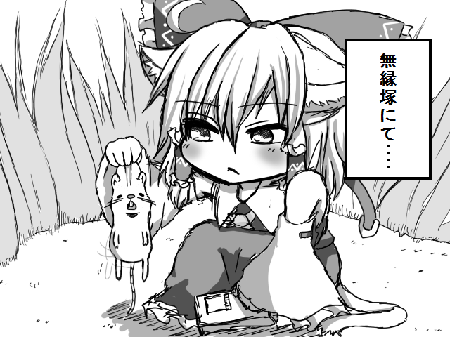 animal animal_ears blush bow cat_ears cat_tail detached_sleeves grass hair_bow hair_tubes hakurei_reimu kurobane minigirl monochrome mouse mousetrap nontraditional_miko short_hair solo tail touhou translated translation_request wide_sleeves
