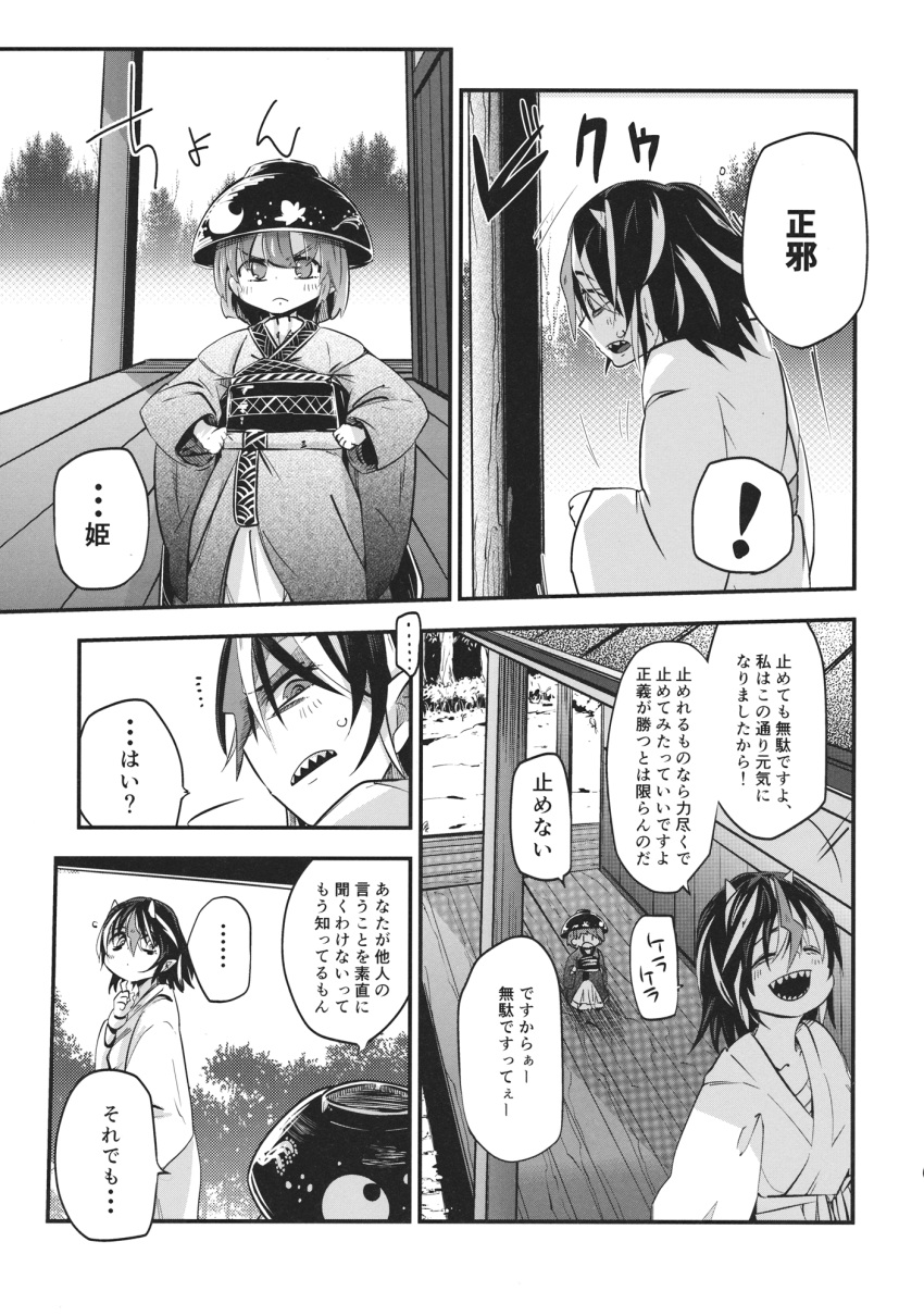 2girls bowl bowl_hat comic greyscale hat highres horns japanese_clothes kijin_seija kimono long_sleeves medium_hair minigirl monochrome multicolored_hair multiple_girls obi robe sash sharp_teeth short_hair streaked_hair sukuna_shinmyoumaru teeth touhou translation_request waira