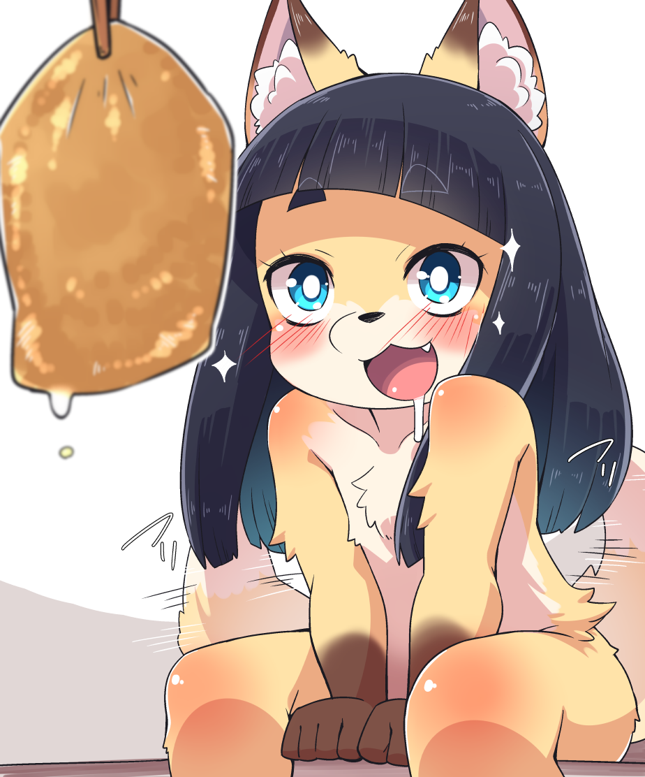 :d afterimage animal_ears between_legs black_hair blue_eyes blush chopsticks clenched_hands drooling eyebrows_visible_through_hair fang food fox_ears fox_tail furry hand_between_legs long_hair motion_lines open_mouth original sitting smile solo sparkle tail tail_wagging...