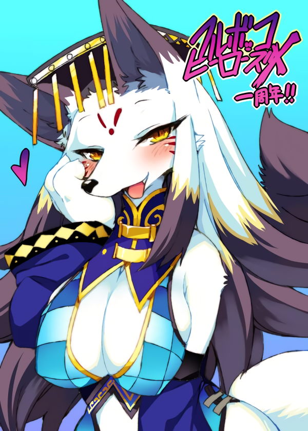1girl black_hair blonde_hair blue_background blush breasts cleavage daji detached_sleeves facial_mark forehead_mark fullbokko_heroes gradient gradient_background hand_on_own_cheek hat heart kishibe large_breasts multicolored_hair open_mouth slit_pupils solo tail upper_body...