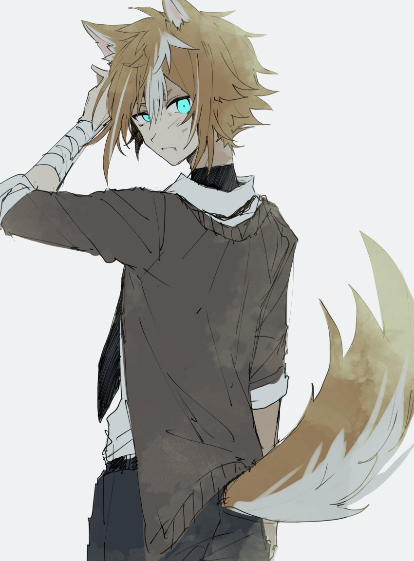 1boy absurdres alternate_costume animal_ears aqua_eyes bandaged_arm bandages bangs brown_hair closed_mouth dirty dirty_face fox_boy fox_ears fox_tail from_behind genshin_impact gorou(genshin_impact) grey_background hair_between_eyes head_tilt highres male_focus multicolored_hair...