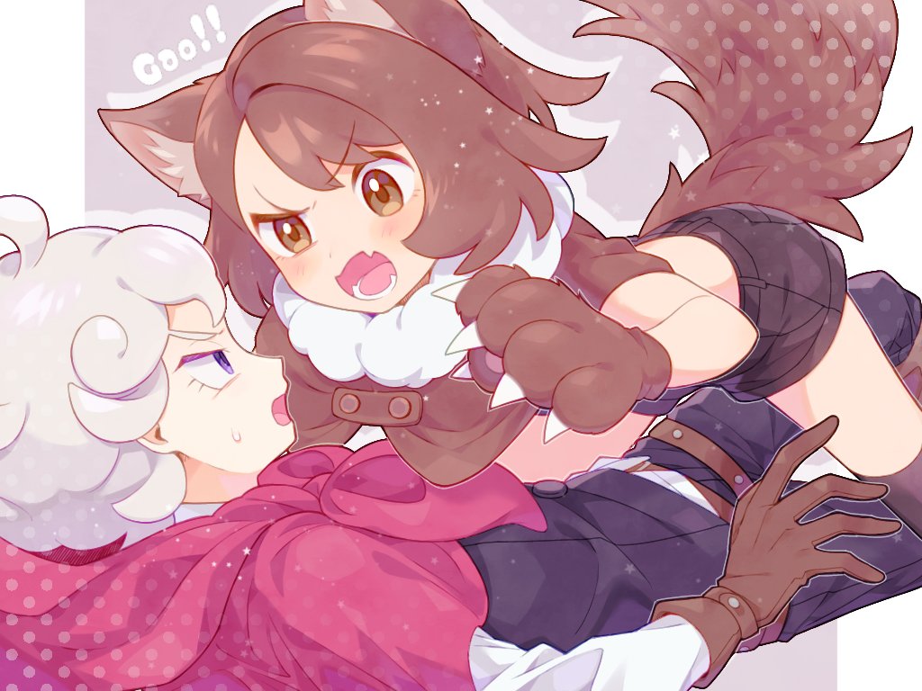 1boy 1girl ahoge alternate_costume animal_ears bangs bede(pokemon) blonde_hair blush bob_cut brown_eyes brown_gloves brown_hair brown_shorts buttons capelet commentary_request curly_hair eye_contact eyebrows_visible_through_hair eyelashes gloria(pokemon) gloves...