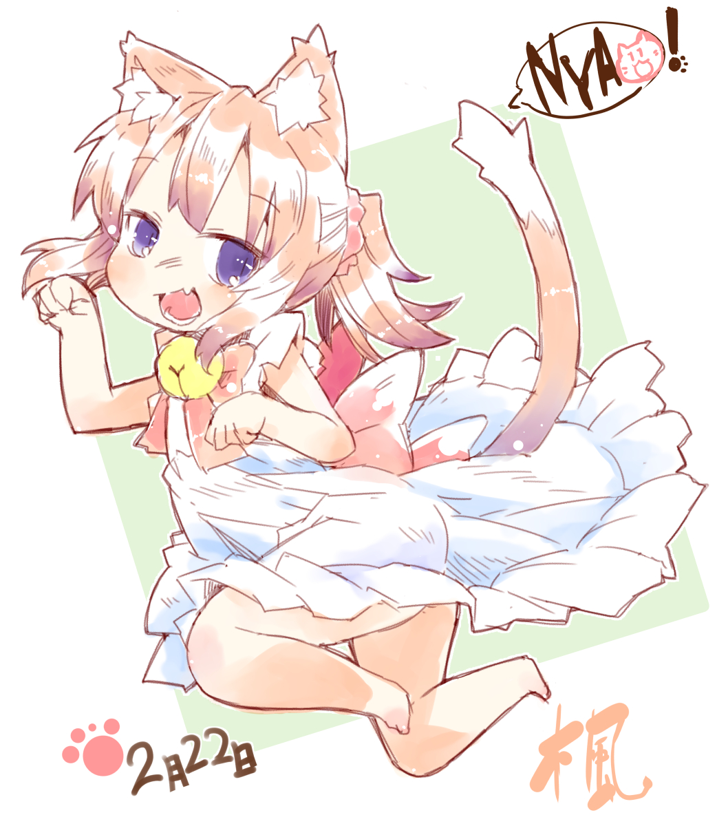 1girl :d animal_ear_fluff animal_ears barefoot bell blush bow brown_hair cat_ears cat_girl cat_tail chibi commentary_request dated dress fang full_body green_background hair_ornament hair_scrunchie hands_up highres hirayuki_rio jingle_bell long_hair nyan open_mouth...