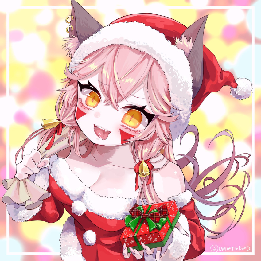 1girl alternate_costume animal_ears artist_name bare_shoulders bell breasts christmas crossed_bangs facial_tattoo gift guardian_tales highres holding holding_gift ice_witch_lupina long_hair looking_at_viewer medium_breasts open_mouth pink_hair santa_costume tattoo tongue...