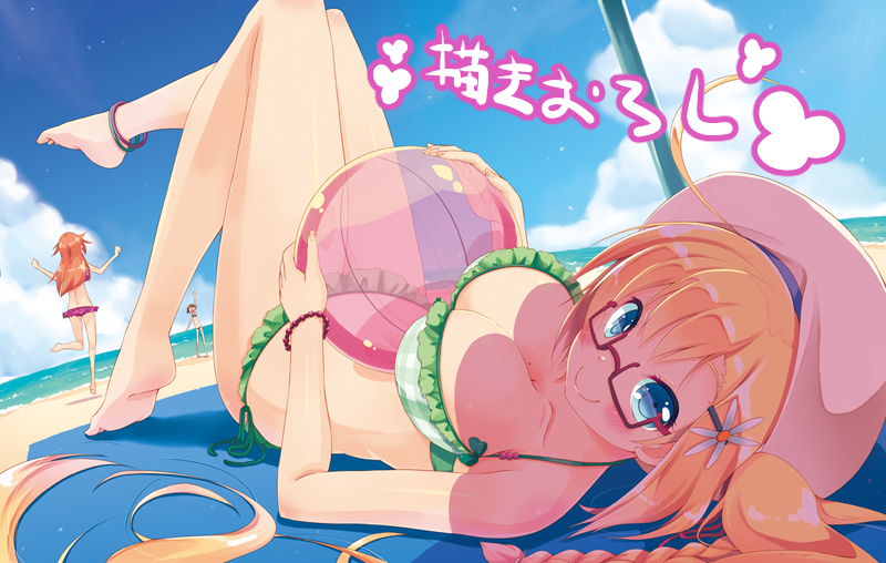 3girls anklet ball barefoot beach beachball bikini blonde_hair blue_eyes braid breasts brown_hair cleavage glasses hair_ornament hairclip hat hirose_madoka jewelry large_breasts long_hair lying multiple_girls ocean on_back original sky smile...