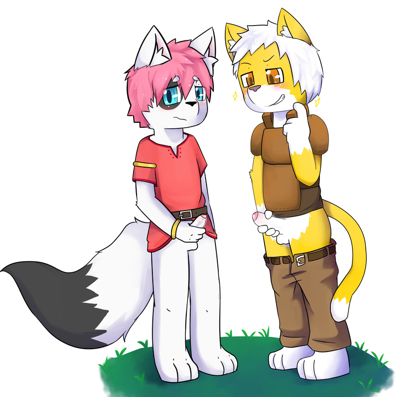 armor, balls, belt, black fur, blue eyes, bottomless, brown eyes, canine, clothed, clothing, feline, fox, fur, hair, humanoid penis, kake0078, leather, male only, mammal, pants, partially retracted foreskin...