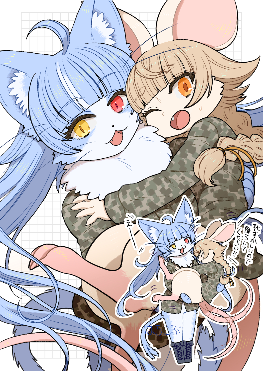 2boys cat_boy furry furry_male hamu_chunchun hatikobu heterochromia highres japan_air_self-defense_force_omaezaki_sub-base mouse_boy multiple_boys omaneko one_eye_closed open_mouth otoko_no_ko translation_request