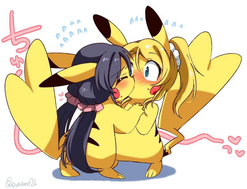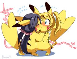 animal_ears animalization ayase_eli blonde_hair blue_eyes blush closed_eyes crossover eromame gen_1_pokemon hair_ornament kiss long_hair love_live! love_live!school_idol_project multiple_girls pikachu pokemon pokemon(creature) ponytail simple_background standing tail...