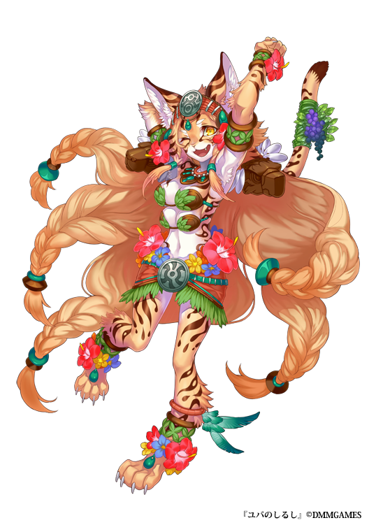 1girl ;d animal_ears anklet arm_up armlet barefoot bra bracelet braid cat_ears clenched_hand dmm extra_breasts flower full_body fur furry gem hibiscus jewelry long_hair looking_at_viewer monster_girl navel official_art one_eye_closed open_mouth...