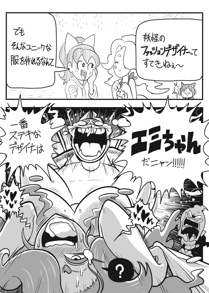 ? breasts cat closed_eyes covering_eyes cyclops enraenra(youkai_watch) gashi-gashi ghost greyscale hair_over_one_eye high_ponytail jibanyan kodama_fumika large_breasts long_hair monochrome multiple_girls multiple_tails nose_drip notched_ear one-eyed open_mouth tail tears...