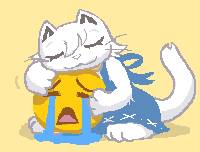 a white cat sitting on the ground with its eyes closed and hands in the air