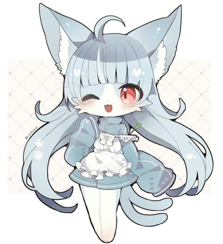 1boy :3 ;d absurdres ahoge alternate_costume animal_ear_fluff animal_ears apron bare_legs barefoot blue_fur blue_hair blue_jacket blue_shorts blue_tail blunt_bangs bow cat_ears cat_girl cat_tail checkered_background chibi commentary_request dot_nose forked_tail frilled_apron...