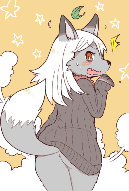 after_transformation anthro bottomless butt canid canine clothed clothing female fox fur fur_lined_clothing grey_body grey_fur hair implied_transformation kemono leaf looking_at_viewer looking_back mammal red_eyes ribbed_clothing ribbed_sweater smoke solo surprise sweater...