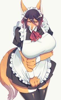 1girl aky_sg6 animal_ears black_hair black_legwear blush breasts brown_eyes cowboy_shot female_focus fox_ears fox_tail furry highres huge_breasts long_hair maid simple_background skindentation snout solo tail thighhighs thighs white_background score:2 rating...