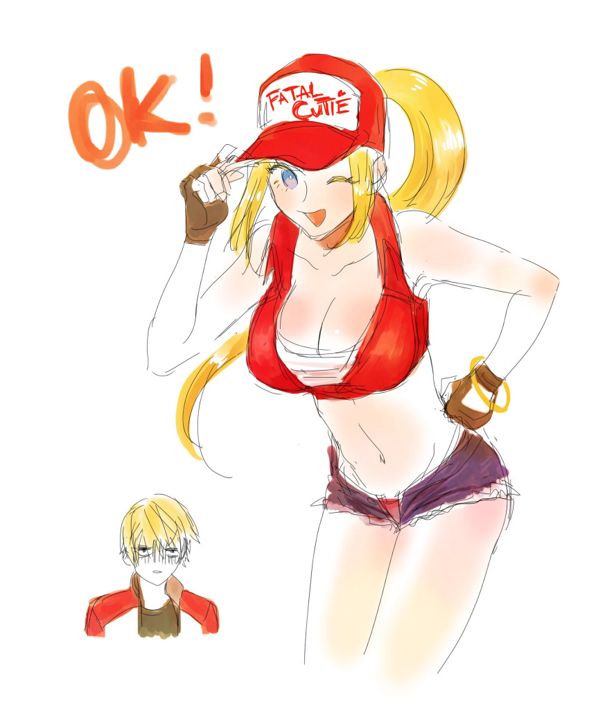 1boy 1girl bent_over breasts cleavage crop_top denim denim_shorts genderswap genderswap(mtf) hand_on_hip hat_tip highres long_hair looking_at_viewer ponytail rock_howard short_shorts shorts simple_background smile snk_heroines:tag_team_frenzy terry_bogard the_king_of_fighters...