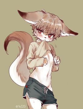 Rule 34 1boy, animal ears, black shorts, bright pupils, brown hair, claws, clothes lift, clothes pull, commentary, commission, dolphin shorts, ears down, english commentary, fox boy, fox ears...