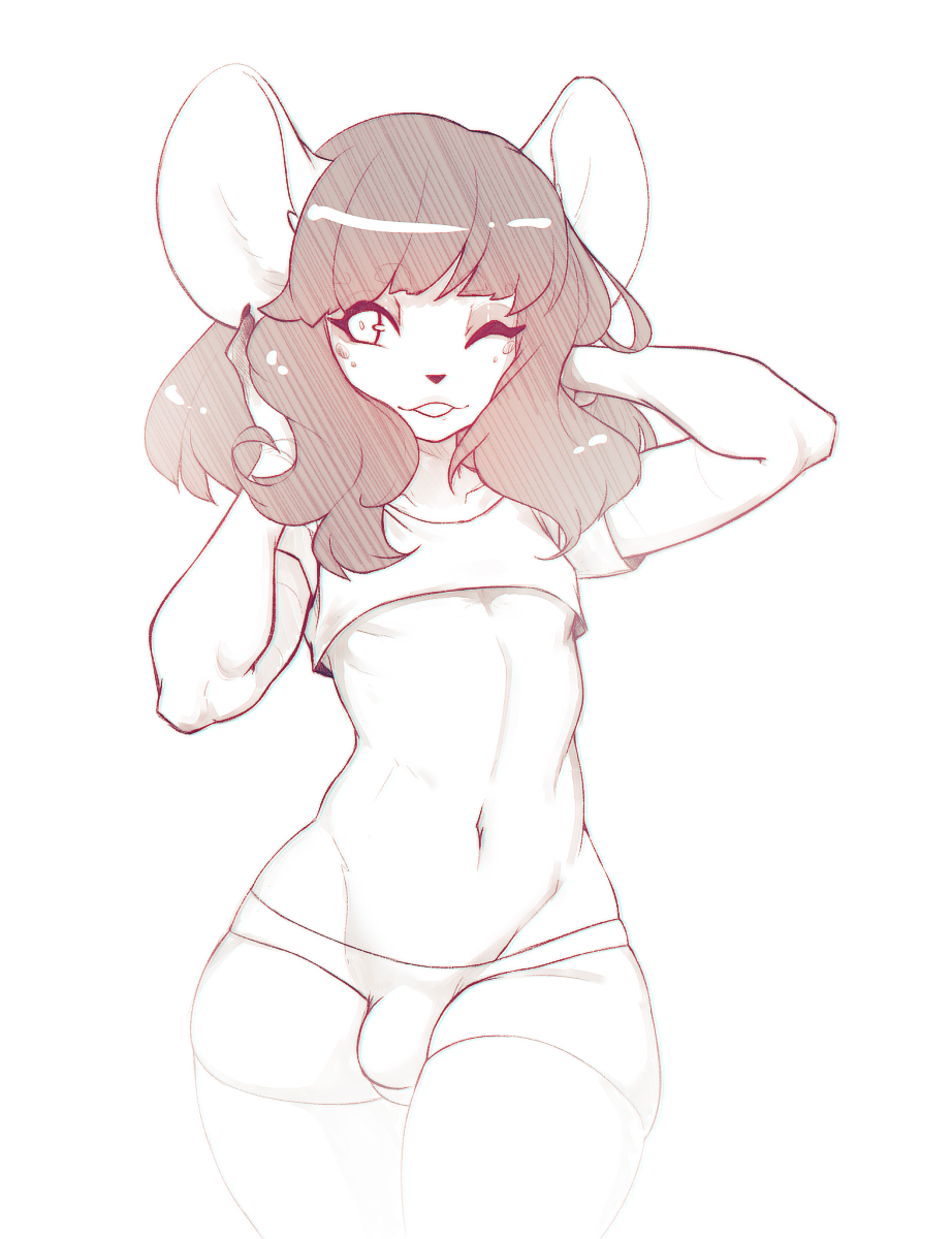anthro bulge clothed clothing crop_top digital_media(artwork) femboy hair hand_in_hair hands_behind_head hi_res legwear long_hair male mammal michi_tsuki midriff mouse murid murine navel one_eye_closed restricted_palette rodent shirt simple_background sketch...