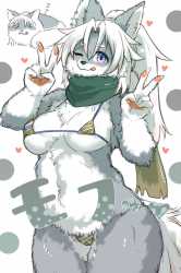 furbooru.orgsuggestive, artist:ookamiwaho, canine, mammal, wolf, anthro, absolute cleavage, big breasts, bikini, breasts, cameltoe, cleavage, clothes, double peace sign, female, gesture, japanese text, looking at you, micro bikini, one eye closed, peace sign, scarf, smiling, smiling at you, solo, solo female, swimsuit, text, tongue, tongue out, winking