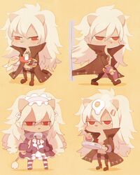1boy aion(myumon)(show_by_rock!!) aion(show_by_rock!!) animal_ears bell black_coat coat collared_coat cosplay cyan(show_by_rock!!) cyan(show_by_rock!!)(cosplay) expressionless frying_pan furry furry_male high_collar holding holding_frying_pan holding_tray jitome lion_boy...